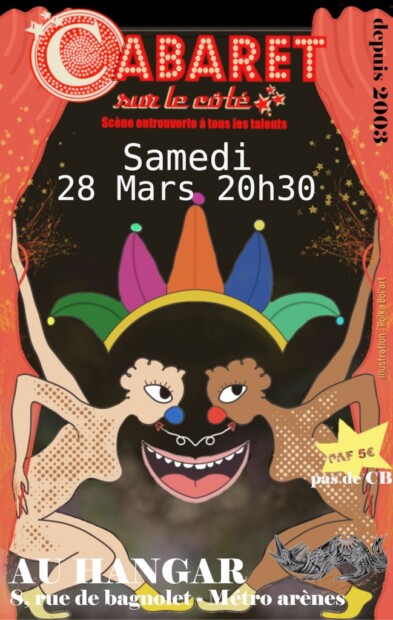 Accueil » Évènements » Cabaret sur le côtéCabaret sur le côtépar manu16. mars 202616. mars 2026 Date : sam 28 mars 2026 Heure : 20:30 - 23:00 Calendrier : ça se passe au Hangar PAF – 5€ pas de CB. Scène entrouverte à tous les talents !